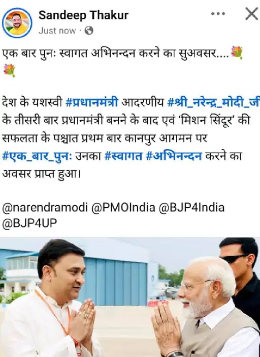 "एक बार पुनः स्वागत, अभिनंदन करने का सुअवसर… देश के यशस्वी प्रधानमंत्री श्री नरेंद्र मोदी जी के कानपुर आगमन पर स्वागत करना गर्व की बात है।"