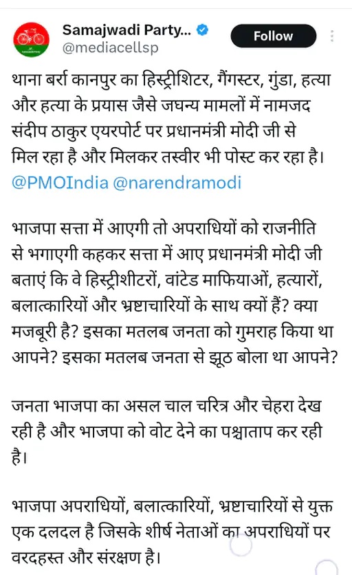 विपक्षी दलों ने इस मुलाकात पर भाजपा को कठघरे में खड़ा कर दिया है। सपा और कांग्रेस का आरोप है कि भाजपा अपराधियों को संरक्षण दे रही है और पीएम की सुरक्षा में लापरवाही हुई है। सोशल मीडिया पर यह मुद्दा ट्रेंड कर रहा है और भाजपा को लगातार सफाई देनी पड़ रही है।