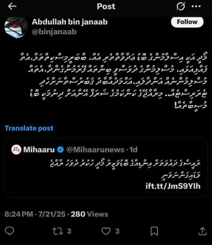 मालदीव के प्रतिष्ठित अखबार अधाधु के अनुसार, विवाद बढ़ने के बाद शेख अब्दुल्लाह ने अपनी पोस्ट डिलीट कर दी है। हालांकि, मालदीव सरकार की ओर से अभी तक इस बयान पर कोई आधिकारिक प्रतिक्रिया नहीं दी गई है।