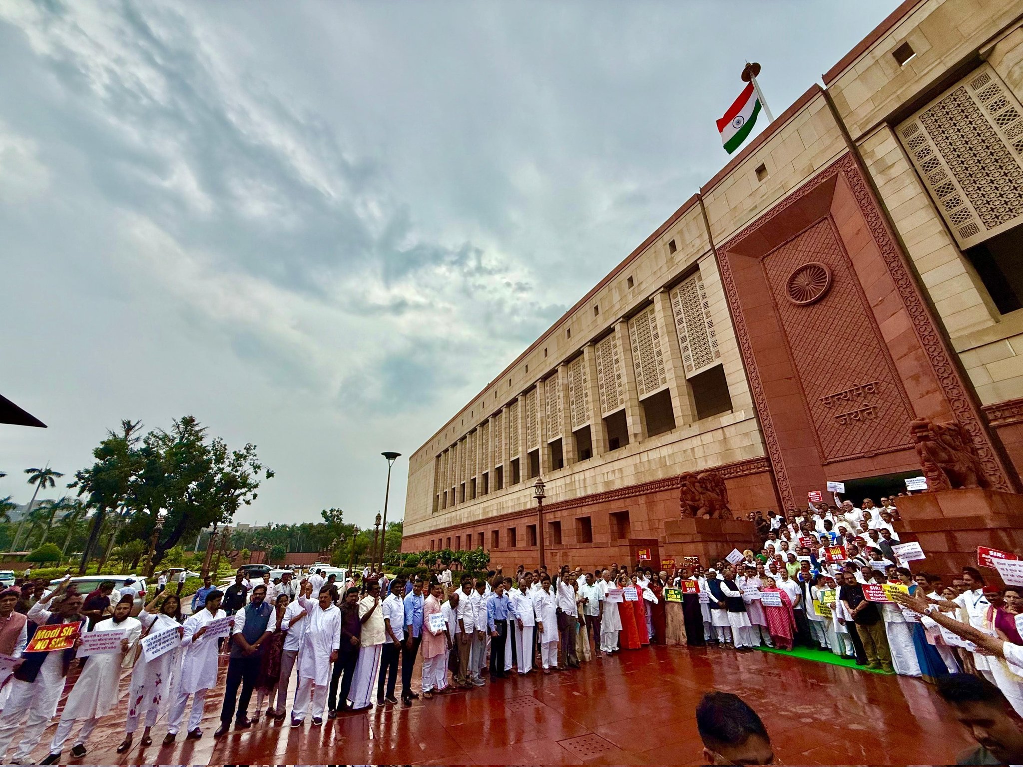 संसद के मानसून सत्र के पांचवें दिन विपक्ष ने बिहार में वोटर वेरिफिकेशन (SIR) प्रक्रिया को लेकर मोदी सरकार के खिलाफ ज़बरदस्त विरोध प्रदर्शन किया। कांग्रेस नेता राहुल गांधी, प्रियंका गांधी वाड्रा और मल्लिकार्जुन खड़गे समेत कई विपक्षी सांसदों ने संसद भवन परिसर में गांधी प्रतिमा से नए संसद भवन के मकर द्वार तक पैदल मार्च निकाला।
