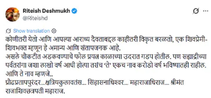 इस पूरे घटनाक्रम के बीच यह विवाद और भी अहम हो गया है, क्योंकि रितेश देशमुख जल्द ही फिल्म राजा शिवाजी में नजर आने वाले हैं। यह फिल्म छत्रपति शिवाजी महाराज के जीवन पर आधारित है और 1 मई को सिनेमाघरों में रिलीज होने जा रही है।