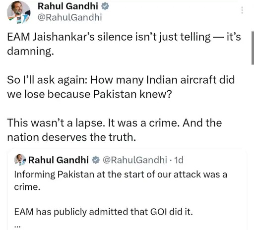 राहुल ने कहा- “सरकार बताए कि कितने भारतीय विमान गिरे? विदेश मंत्री ने कहा कि पाकिस्तान को सूचना दी थी। ये गलती नहीं, अपराध था। देश जानना चाहता है।”