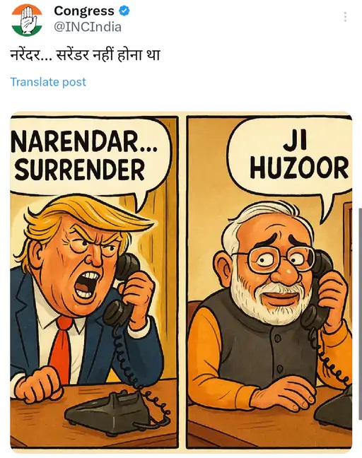 मंगलवार देर रात कांग्रेस ने एक ग्राफिक पोस्टर जारी किया, जिसमें डोनाल्ड ट्रंप पीएम मोदी को फ़ोन पर सरेंडर करने को कहते हैं, और जवाब में मोदी कहते हैं, “जी हजूर।” इस पोस्टर में कांग्रेस ने कटाक्ष करते हुए लिखा, “नरेंदर सरेंडर नहीं होना था।”