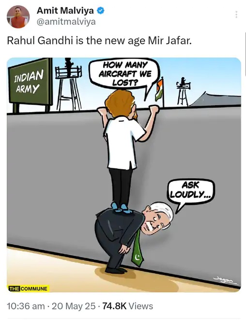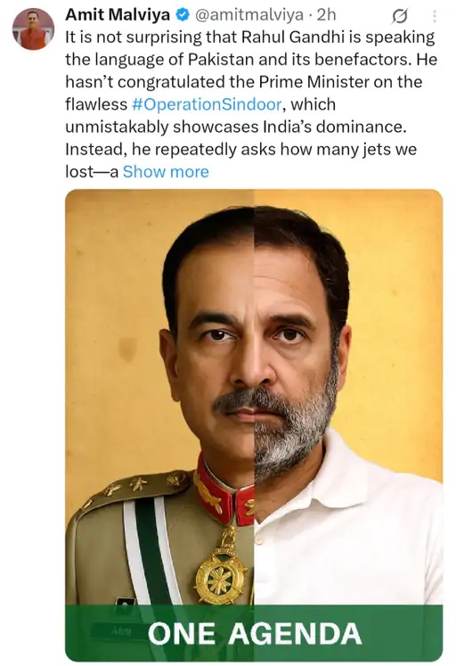 अमित मालवीय ने राहुल पर निशाना साधते हुए कहा- "राहुल गांधी ऑपरेशन सिंदूर की सफलता पर बधाई तक नहीं दे पाए, बल्कि बार-बार पूछते हैं कि हमने कितने एयरक्राफ्ट खो दिए। मगर उन्होंने यह नहीं पूछा कि हमने कितने पाकिस्तानी जेट मारे।"