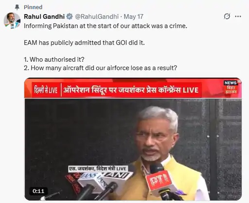 17 और 19 मई को राहुल गांधी ने विदेश मंत्री एस जयशंकर को सीधे निशाने पर लेते हुए आरोप लगाया था कि सरकार ने पाकिस्तान को एयर स्ट्राइक की जानकारी पहले ही दे दी थी।