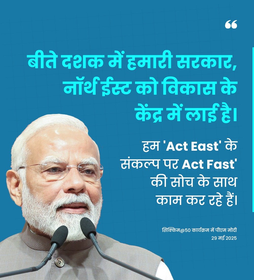 प्रधानमंत्री ने बताया कि केंद्र सरकार 'सबका साथ, सबका विकास' के मंत्र के साथ सभी राज्यों को समान अवसर देने के लिए प्रतिबद्ध है। "जब मैंने 2014 में पहली बार प्रधानमंत्री पद की शपथ ली, तभी यह स्पष्ट कर दिया था कि भारत के विकास में हर राज्य और क्षेत्र की समान भागीदारी जरूरी है। इसी सोच के साथ उत्तर-पूर्वी भारत को हमारी सरकार ने विकास के केंद्र में रखा है।" उन्होंने आगे कहा कि सरकार ‘एक्ट ईस्ट नीति’ को ‘एक्ट फास्ट दृष्टिकोण’ के साथ आगे बढ़ा रही है, ताकि इस क्षेत्र की अपार संभावनाओं को जल्दी और प्रभावी रूप से साकार किया जा सके।