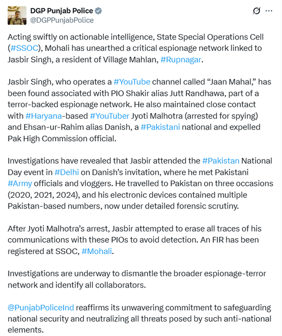 पंजाब पुलिस ने एक बड़े खुलासे में पाकिस्तान के लिए जासूसी करने के आरोप में मशहूर यूट्यूबर जसबीर सिंह को गिरफ्तार किया है। जसबीर सिंह रूपनगर जिले के महलां गांव का निवासी है और उसके यूट्यूब चैनल 'जान महल' पर 10 लाख से अधिक सब्सक्राइबर हैं। पुलिस के अनुसार, वह तीन बार पाकिस्तान यात्रा कर चुका है और वहां के सैन्य अधिकारियों व एजेंटों के संपर्क में रहा है।