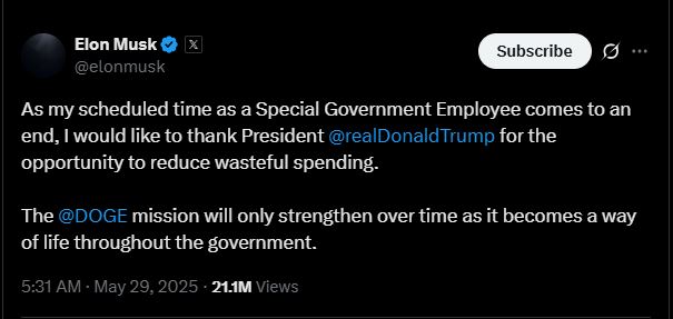 मस्क को ट्रम्प ने डिपार्टमेंट ऑफ गवर्नमेंट एफिशिएंसी (DOGE) का प्रमुख नियुक्त किया था, जिसका उद्देश्य सरकारी खर्चों में कटौती और फिजूलखर्ची रोकना था।