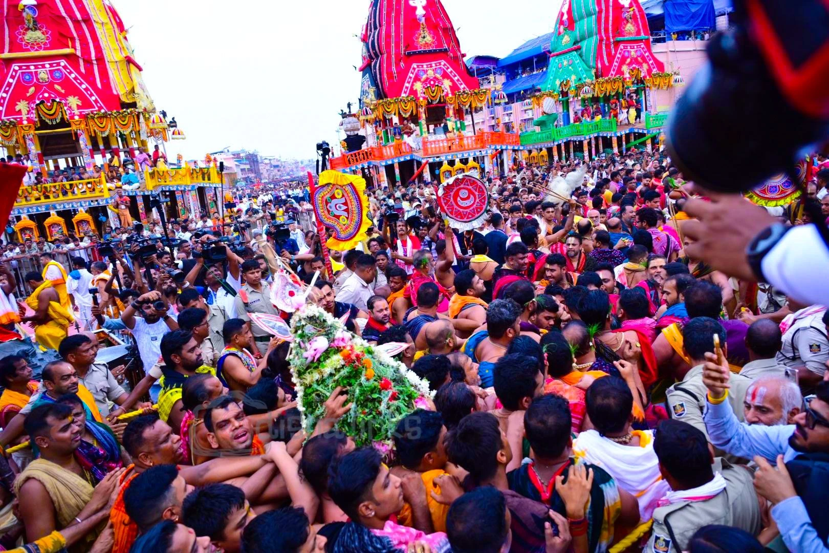 भगवान जगन्नाथ, सुभद्रा और बलभद्र रथ पर विराजित : पुरी में 4 बजे से शुरू होगी भव्य रथ यात्रा; 12 लाख भक्तों की उमड़ी भीड़